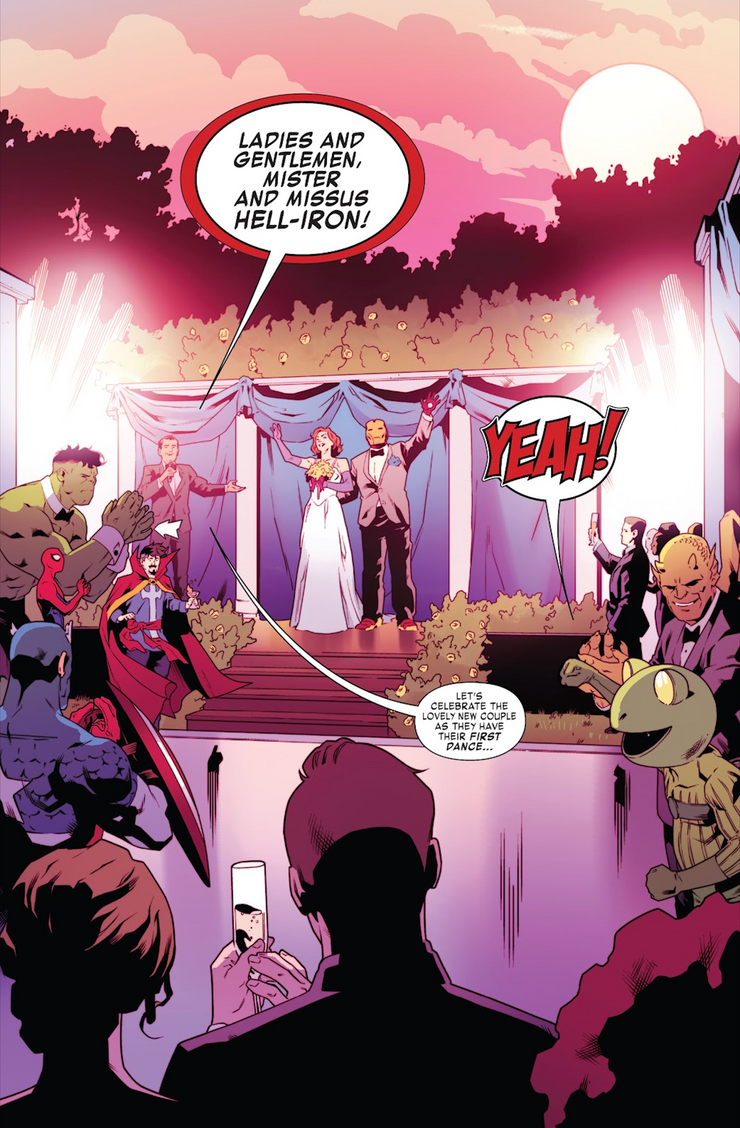 Desafortunadamente, Patsy rechazó la propuesta de Tony, no porque no lo ame, sino porque necesita más tiempo para pensar en una decisión que cambiará su vida. Pero en Iron Man/ Hellcat Anual #1, escrito por Christopher Cantwell con arte de Ruairi Coleman, la boda parece seguir adelante de todos modos. Mientras Iron Man y Hellcat bailan frente a docenas de invitados, el organizador de bodas anuncia a la feliz pareja. “¡Damas y caballeros, señor y señora Hell-Iron!”