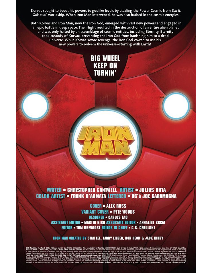 En su serie actual en curso en Marvel Comics, Tony Stark absorbió algunos de los Power Cosmis de Galactus Worldship en un esfuerzo por detener a Korvac, quien obtuvo los mismos poderes. Sin embargo, después de una batalla épica entre el Dios de Hierro y Korvac en el Cosmos, el Tribunal Viviente y más entidades cósmicas interrumpieron y se llevaron al villano. Ahora, Iron Man se pregunta cómo hacer de su mundo un lugar mejor con sus nuevos poderes. ¿Pero usará sus poderes responsablemente? Los Vengadores no están seguros de que eso suceda y se enfrentan al héroe impulsado por Dios.