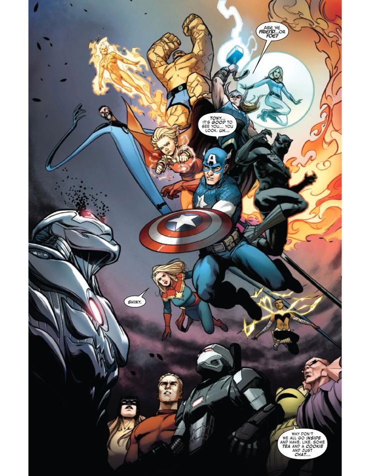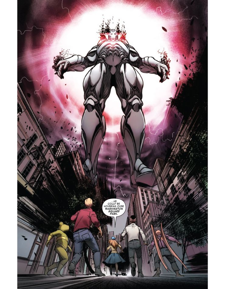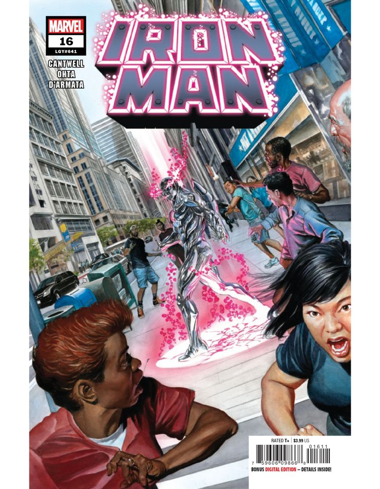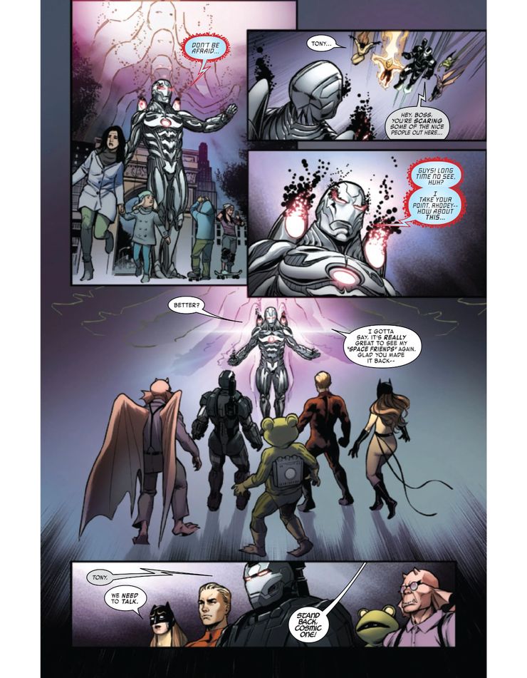 En Hombre de Acero (H/T CBR) # 16 de Christopher Cantwell, Julius Ohta, Frank D’Armata y Clayton Cowles de VC, el Dios de Hierro de tamaño gigante aterriza en la Tierra frente al improbable grupo de héroes que lo ayudaron en el espacio. La llegada de Iron Man causa pánico a su alrededor, lo que hace que se encoja de tamaño. Sin embargo, antes de que pueda tener una conversación con su equipo, llegan los Vengadores y pronto se dan cuenta de que están tratando con su amigo transformado.