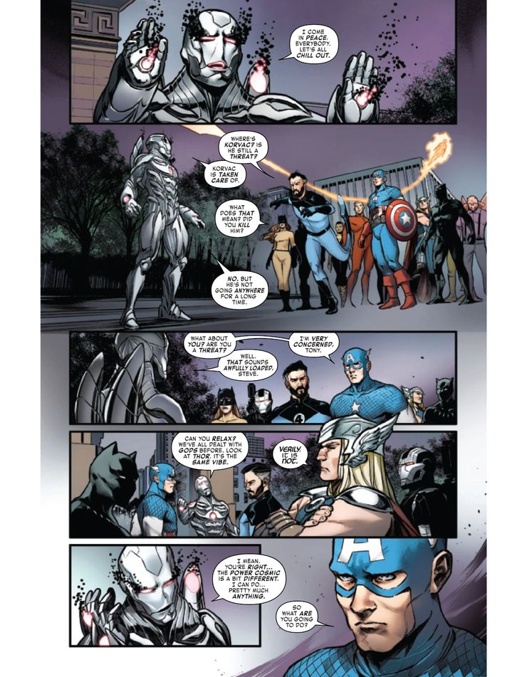 Después de darse cuenta de que Iron Man era un amigo y no un enemigo, el héroe asegura a los Vengadores que viene en son de paz. Le informa al equipo que Korvac ha sido atendido antes de que el Capitán América le pregunte si es una amenaza, y le revela a Iron Man que está muy preocupado por su transformación. Iron Man incluso intenta calmar al equipo diciéndoles que han tratado con dioses antes como Thor, por lo que “es el mismo ambiente”. Como era de esperar, el Capitán América no está impresionado y le pregunta qué planea hacer con Power Cosmic.