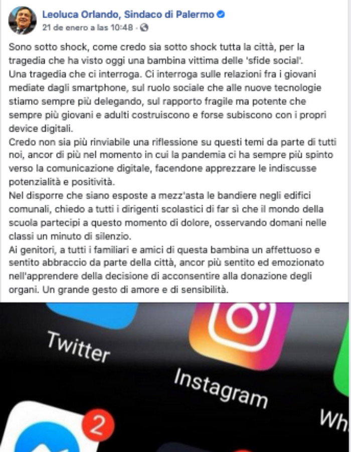 “Creo que una reflexión sobre estos temas por parte de todos ya no puede posponerse, más aún en un momento en el que la pandemia nos ha empujado cada vez más hacia la comunicación digital, haciéndola apreciar su indiscutible potencial y positividad”, publicó Leoluca Orlando en un mensaje en Facebook.