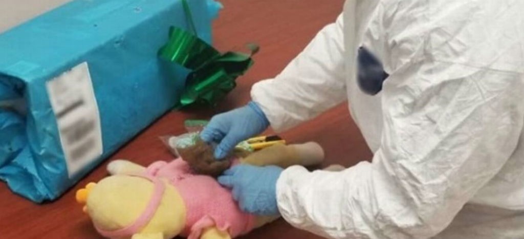 En un comunicado, detalló que al abrir una caja de cartón hallada por el perro entrenado en detección de narcóticos, se encontró un peluche en forma de chango que escondía un saco de tela con pastillas de color azul con las características de la droga.