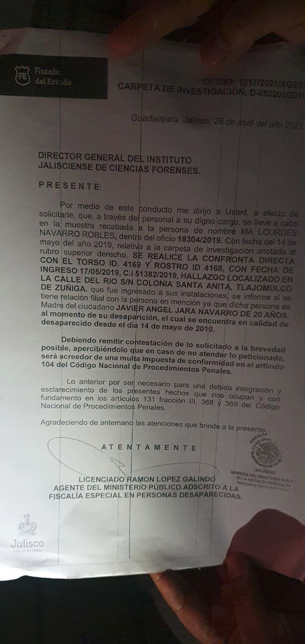 El documento al que se refiere Judith Ramos, en manos de Aristegui Noticias, se trata del comunicado 18304/2019 en el que la Fiscalía estatal explica, con fecha del 14 de mayo de 2019, que en la calle Del Río, de la colonia Santa Anita de Tlajomulco de Zúñiga, las autoridades iniciaron una carpeta de investigación debido al descubrimiento del cuerpo de Ángel con identificador 4,169 en el torso. Este documento, junto a la clave de identificación, jamás fue entregado al personal del IJCF por lo que los trabajadores no comenzaron con la labor de búsqueda. Es decir, una cadena de omisiones que termina en falsas esperanzas para una madre.