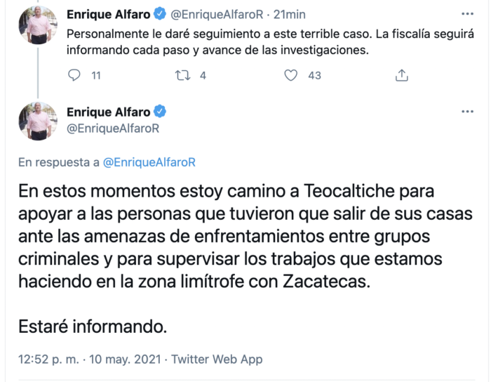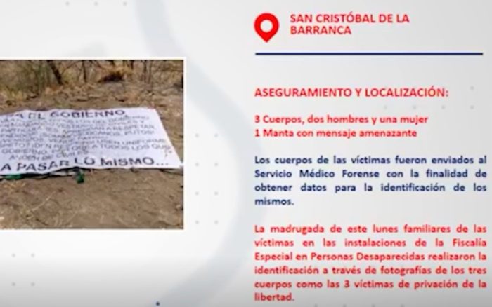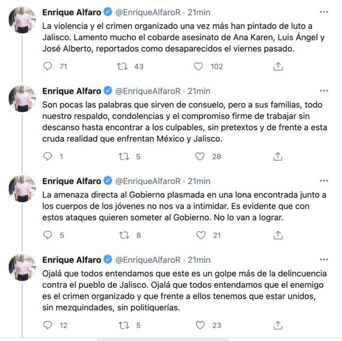 Por su parte, el gobernador de Jalisco, Enrique Alfaro, comentó: “la amenaza directa al gobierno plasmada en una lona encontrada junto a los cuerpos de los jóvenes no nos va a intimidar. Es evidente que con estos ataques quieren someter al Gobierno. No lo van a lograr”.
