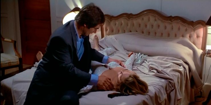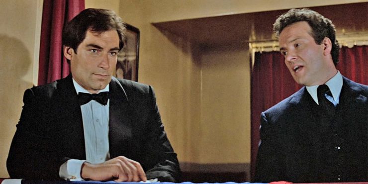 Pero los matones del recién arrestado Franz Sánchez irrumpieron en la casa esa noche y capturaron a Félix. Bond luego encontró la inquietante vista de Della asesinada en su vestido de novia. Además, encontró a Félix, apenas vivo, que había sido parcialmente alimentado con un tiburón. Por estas y otras razones, licencia para matar es considerada la película de Bond más oscura y violenta.