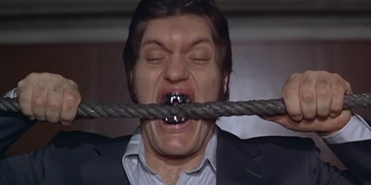 No son solo los dientes de tiburón lo que hacen que Jaws se destaque, es su resistencia general. Cuando un coche lleno de secuaces persigue a Bond y choca contra una casa, Tiburón es el único que sale ileso. Con los dientes, puede morder cualquier cosa, lo que significa que rara vez necesita un arma para matar gente.