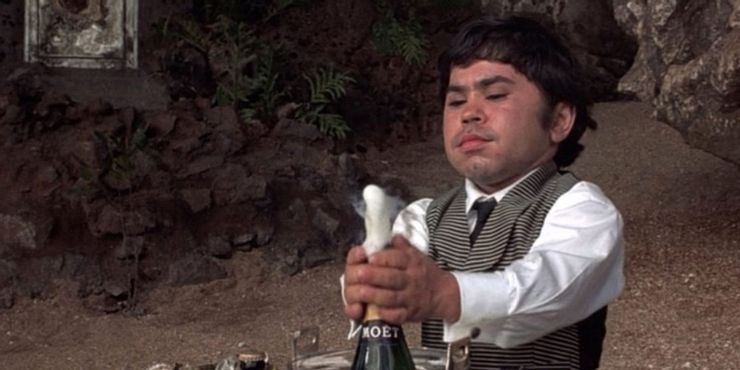 Scaramanga tiene tres pezones, una isla y una pistola de oro, pero eso es todo. El asesino no es tan intrigante como su mayordomo y ama de llaves, Nick Nack. El secuaz no solo tiene un nombre mejor que el de su jefe, sino también una habilidad especial para frustrar a Bond.