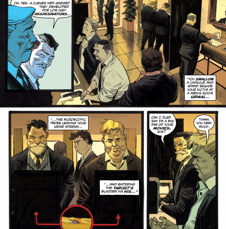 Después de la misión con el ex Papa, los dos hombres que siguen el recuento actual de cadáveres de Roland King discuten otro de sus asesinatos durante el cual el superespía parecido a James Bond utiliza un dispositivo realmente repugnante adquirido en el segundo número. King decide matar a un pez gordo de Hollywood, confrontándolo en el baño de un restaurante y citando “cómo tratas a las mujeres y las múltiples acusaciones de violación de las que te escapaste”. Antes de esto, utiliza un ‘Dispositivo de Smart P*ss. Para usarlo, el asesino debe tragar una cápsula que contiene el dispositivo, luego pararse junto a su objetivo en un urinario, momento en el que el dispositivo microscópico sale del chorro de orina del asesino, se mueve a través del sistema y se dirige a la vejiga de la persona. asesino desea matar. Luego, el dispositivo nada por la corriente del objetivo asignado y se incrusta en su cuerpo hasta que el asesino utiliza el detonador, lo que desencadena una explosión considerable.