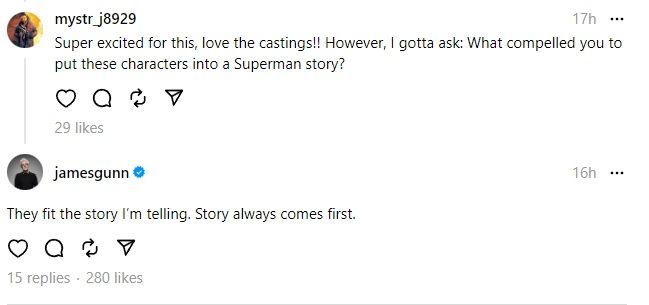 Un fan, @Mystr_j8929, preguntó qué “obligado” el cineasta para hacer de estos personajes parte de la última aventura cinematográfica de Superman. Para Gunn, simplemente “encaja en la historia” él está diciendo porque siempre priorizará el arco, como “La historia siempre es lo primero”.