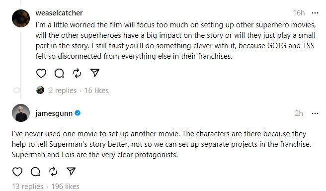 Al hablar con @WeaselCatcher, quien estaba “Me preocupa un poco que la película se centre en preparar otras películas de superhéroes”. Gunn enfatizó que Superman: legado no pretende servir como plataforma para lanzar otras películas derivadas. Los héroes están ahí para “Cuenta mejor la historia de Superman” esencialmente diciendo que son jugadores de apoyo.