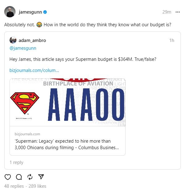 Cuando Adam_Ambro le preguntó si era cierto que Superman: Legado El presupuesto fue supuestamente de 364 millones de dólares.afirmó Gunn, “Absolutamente no. ¿Cómo diablos creen que saben cuál es nuestro presupuesto?”. En el momento de la publicación de esta historia, el funcionario Superman: legado El presupuesto no ha sido hecho público.