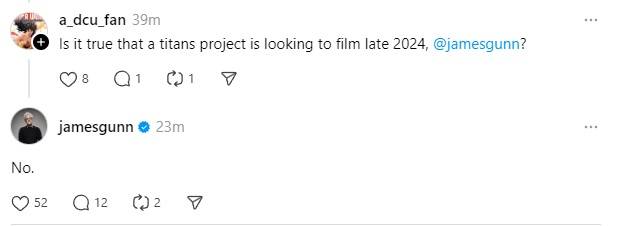 Mientras que Gunn Superhombre La película aún se está filmando, al codirector ejecutivo de DC Studios se le preguntó en Threads si había algo de verdad en los informes de que Jóvenes titanes comenzará a filmarse a fines de 2024 (según se incluye en un documento de Film & Television Industry Alliance). Gunn no tardó mucho en responder: desacreditando la idea de que filmar en Jóvenes titanes Comenzará en 2024.