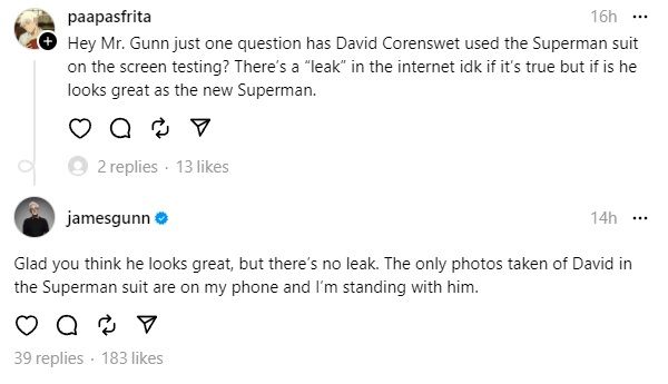 Con Superman: legado Preparándose para comenzar la producción en marzo, se filtraron un par de imágenes de Corenswet con su supuesto disfraz de Superman y ganaron mucha atención en línea. Sin embargo, Gunn no tardó mucho en abordarlo en Threads.