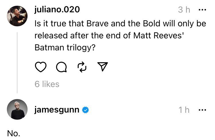 En hilos, Gunn reveló que Los valientes y los Bravos se estrenará antes de que el director Matt Reeves termine su el batman trilogía.