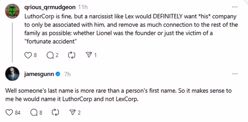 Después de que otro usuario respondió, “LuthorCorp está bien, pero un narcisista como Lex DEFINITIVAMENTE querría que *su* empresa solo estuviera asociada con él y eliminara la mayor conexión posible con el resto de la familia; ya sea que Lionel fuera el fundador o simplemente la víctima de un “accidente afortunado”” Gunn explicó que, “Bueno, el apellido de alguien es más raro que el nombre de una persona. Así que tiene sentido para mí que lo llame LuthorCorp y no LexCorp”.