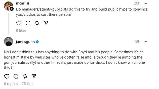 Mccarlisi preguntó si Gunn cree que “¿Los gerentes/agentes/publicistas hacen esto para tratar de generar entusiasmo público para convencerlo a usted/a los estudios de elegir a esa persona?” Gunn respondió con, “No, no creo que esto tenga nada que ver con Boyd y su gente. A veces es un error honesto cometido por sitios web que han obtenido información falsa (aunque se están adelantando periodísticamente) y otras veces simplemente es una compensación”. clics. No sé cuál es”.