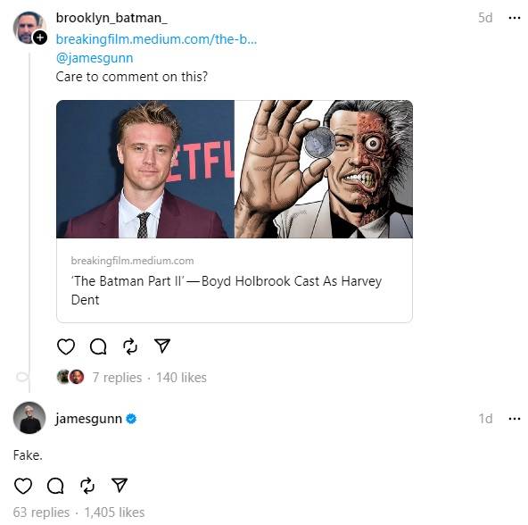 Cuando brooklyn_batman_ le pidió que comentara sobre un rumor de que Boyd Holbrook había sido elegido como el enemigo de DC Harvey Dent, también conocido como Two-Face, Gunn comentó: “Falso.”