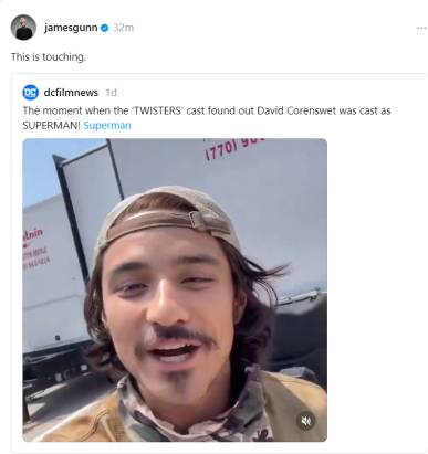 Gunn respondió al video diciendo: “Esto es conmovedor.” Múltiple Tornados Los miembros del elenco, como Glen Powell, que es un favorito de los fanáticos del DCU por muchos papeles de superhéroes, y Daisy Edgar-Jones, mostraron su apoyo saltando de felicidad y tocando bocinas de autos para celebrar el gran logro de Corenswet. Tornados Los coprotagonistas están en el elenco del reinicio de Superman, Tornados Estrellas como Powell aún podrían unirse al DCU en el futuro.