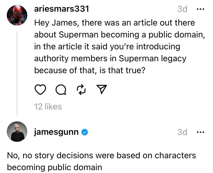 - La respuesta de Gunn indica que no existe una conexión directa entre el posible estado de dominio público de Superman y la película de reinicio planificada de DC Universe.