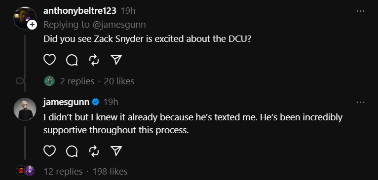 Después de los comentarios públicos de Snyder, Gunn recurrió a Threads para explicar la reacción privada de Snyder ante la DCU. Un compañero usuario de Threads le pidió a Gunn que respondiera, y él dio una respuesta concisa y positiva. Mira su respuesta a continuación: