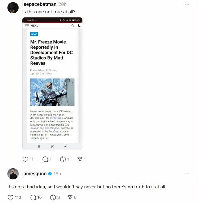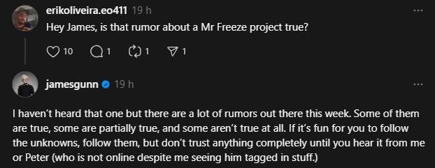 On Threads, jefe creativo de DC Universe James Gunn habló sobre la veracidad de los rumores de DC que salieron a la luz la semana pasada cuando se le preguntó sobre una película de Mr. Freeze..