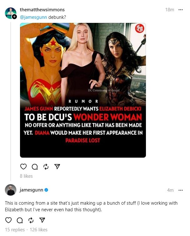 Mientras que Gunn Superhombre La película ya está en producción, los fanáticos de DC Universe ya están ansiosos por saber quién interpretará a la icónica heroína de Amazon. A pesar de estar ocupado filmando su nueva película, a Gunn le preguntaron en Threads si un reciente rumor sobre el casting de Wonder Woman era cierto o no.