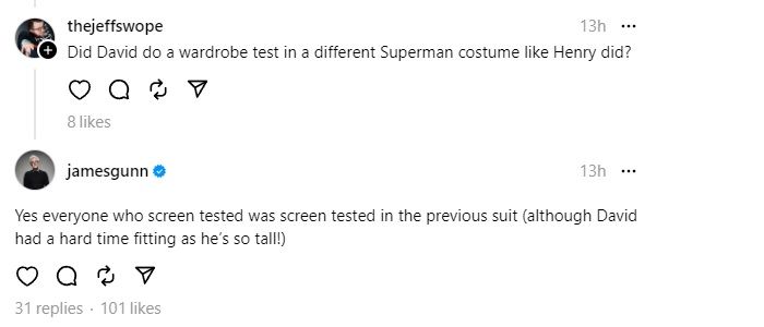 - James Gunn revela que cuando David Corenswet hizo la prueba de pantalla para Superman: Legacy, tuvo dificultades para ponerse un viejo disfraz de Superman debido a su gran altura.