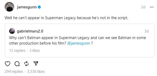 Con el Superman: legado El elenco se está preparando para comenzar la fotografía principal en Atlanta en marzo, todavía hay un jugador importante de DC sobre el que los fanáticos se han estado preguntando. Recientemente se le preguntó a Gunn en Threads por qué Batman no puede aparecer en Superman: legadoy el cineasta tiene una respuesta simple.