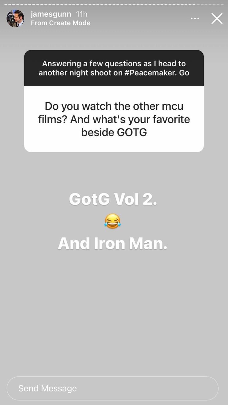 Durante un período de respuesta a los fans en su Instagram de camino a una sesión nocturna para HBO Max’s Pacificador, Se le preguntó a Gunn cuáles son sus películas favoritas de MCU fuera del Guardianes serie. Después de tirar en broma Guardianes de la Galaxia Vol. 2, reveló que su favorito es el de 2008 Hombre de Acero. El éxito de taquilla dirigido por Robert Downey Jr. dio inicio al MCU.