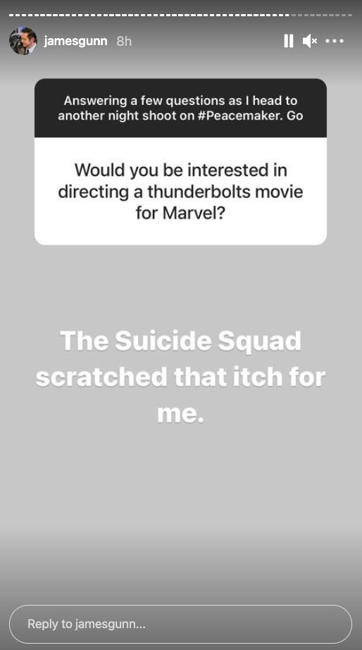 Si bien todavía no está claro cuándo o si los Thunderbolts harán su primera aparición en el MCU, Gunn parece haber cambiado de opinión desde 2014. Durante una rápida sesión de preguntas y respuestas en Instagram antes de salir a filmar el Pacificador serie, se le preguntó a Gunn si todavía estaba interesado en dirigir una Rayos película para Marvel. Gunn respondió, diciendo que hacer El escuadrón suicida “se rascó esa picazón” para él. Vea una captura de pantalla de la interacción completa en Instagram a continuación: