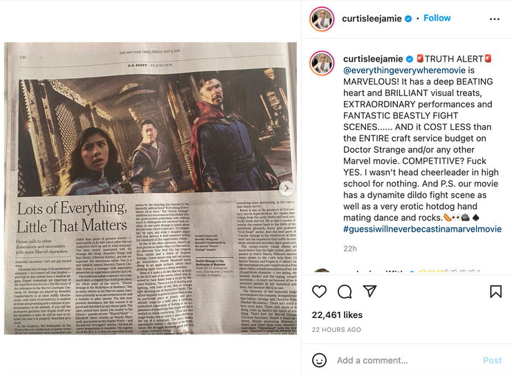 Jamie Lee Curtis comparte una publicación promocionando Everything Everywhere All At Once comparando su presupuesto con Doctor Strange in the Multiverse of Madness.