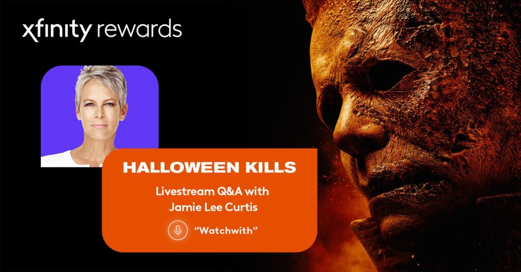 Según el comunicado de prensa, “Para celebrar el lanzamiento de la nueva película Muertes de Halloween en cines y transmitiendo solo en Peacock el 15 de octubre, Xfinity Rewards anunció hoy un exclusivo Muertes de Halloween evento de transmisión en vivo con la estrella Jamie Lee Curtis, el director y coguionista David Gordon Green, y el productor Jason Blum el martes 5 de octubre a las 8 pm ET. El evento será organizado por el legendario cineasta Mick Garris y está disponible exclusivamente para los miembros de Xfinity Rewards. Los espectadores escucharán el plato de las leyendas de Hollywood sobre su nueva película e incluso tendrán la oportunidad de participar en una sesión interactiva de preguntas y respuestas en vivo. Los clientes de Xfinity X1 y Xfinity Flex en todo el país pueden simplemente decir “Xfinity Rewards Livestream” en el control remoto por voz de Xfinity para unirse mientras el evento está en vivo o para disfrutar del evento archivado al día siguiente.