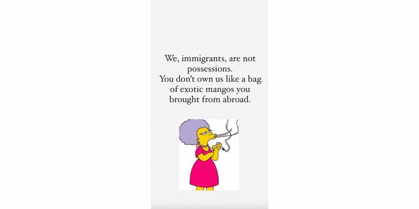 Recientemente, Jazmín Aprovechó su historia de Instagram para dar una pista de lo que pudo haber provocado su separación de Gino. Escribió: “Nosotros, los inmigrantes, no somos posesiones”, usando una foto de un personaje lesbiana encubierto llamado Patty de Los Simpsons.