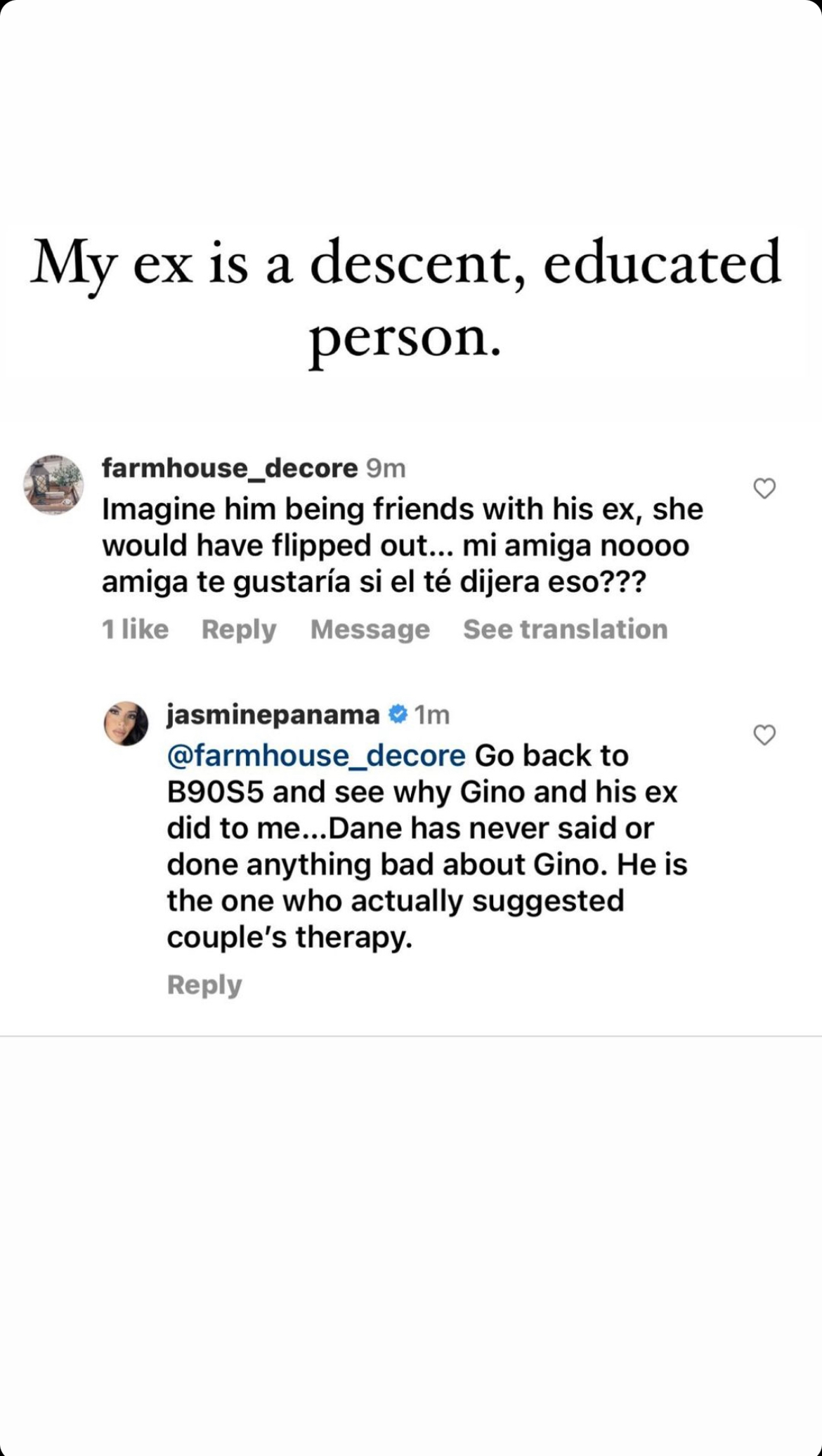 Un fan le comentó a Jasmine: “Imagínalo siendo amigo de su ex, ella se habría vuelto loca…a lo que ella respondió:Vuelve a B90S5 y mira lo que Gino y su ex me hicieron….” Jasmine compartió cómo Dane nunca ha dicho o hecho nada malo sobre Gino. Según Jasmine, Dane fue quien sugirió que Jasmine y Gino deberían probar la terapia de pareja.