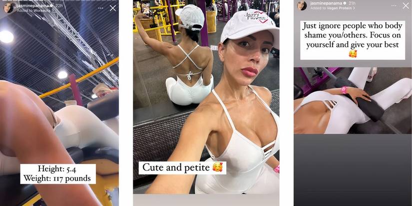 La bella panameña documentó los ejercicios que realiza en el gimnasio a través de Instagram Stories mientras revelaba detalles sobre su altura y peso actual. Jasmine mencionó que Ella mide cinco pies y cuatro pulgadas de alto y actualmente pesa 117 libras.Ella compartió una historia diferente, en la que hizo alarde de su cuerpo con un giro y agradeció a su entrenador. Se llamó a sí misma “Linda y pequeña” después de publicar una selfie frente al espejo con su ropa deportiva blanca en el gimnasio.