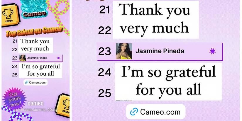 Más recientemente, Jazmín Publicó una foto de la tabla de clasificación en su historia de Instagram, revelando que ella se ha mudado en el ranking en el sitio web. Anteriormente clasificado en el número 27 entre los 100 mejores creadores de cameos, Jasmine ahora ocupa con orgullo el lugar número 23. En su historia de celebración, se etiquetó como una “Top talento” y alentado Prometido de 90 días Fans para obtener un video personalizado de ella compartiendo el enlace a su cameo.