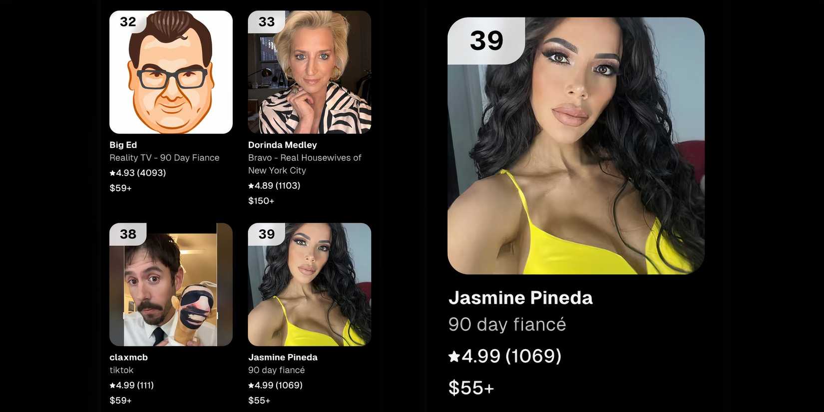 La disminución en la clasificación de Jasmine a la posición 39 sugiere que Los fanáticos pueden estar comprando menos videos de cameo de ella. Este cambio indica que Jasmine probablemente está ganando menos de lo que era hace unos meses cuando fue uno de los mejores talentos de la plataforma. Jasmine podría aumentar su popularidad al participar en otro spin-off. Los rumores sugieren que podría unirse al elenco de 90 días: la vida soltera Temporada 5 para mostrar su historia como una mujer embarazada y su nueva relación con Matt Branis.