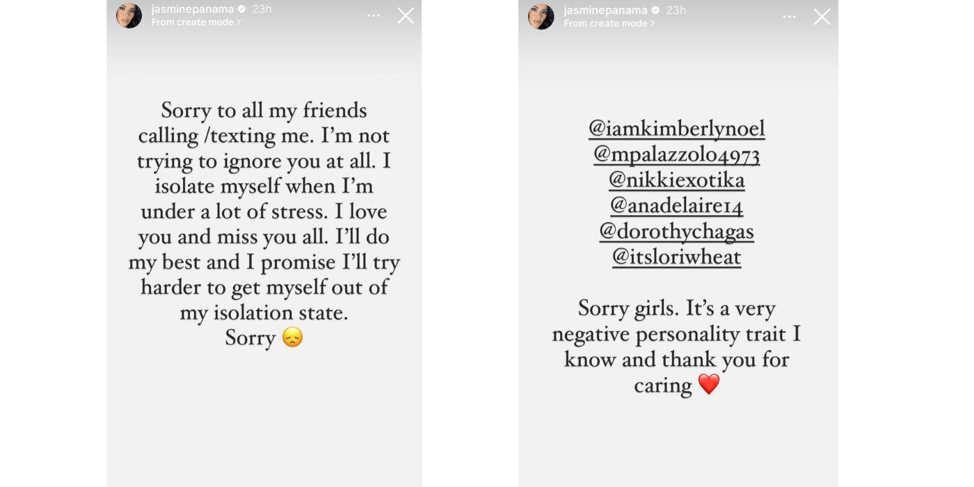 Jasmine les dijo a sus amigas que no intentaba ignorarlas en absoluto. Lo que ella quería hacer era aislarse. Es algo que hace cuando está bajo mucho estrés. Jasmine añadió que amaba y extrañaba a sus amigos. Ella les prometió que sería haciendo lo mejor que puede y esforzándose más por salir de ella”estado de aislamiento.” Jasmine etiquetó a sus amigas en la siguiente historia de Instagram y tenía un par de nombres sorprendentes.