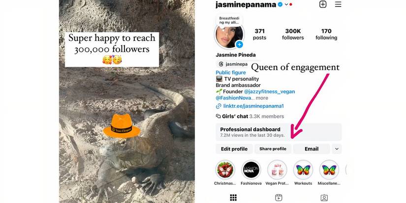 A través de sus tácticas en las redes sociales, Jazmín Ahora ha logrado un hito importante en su carrera al ganar 300.000 seguidores en Instagram. Marcó este logro publicando una foto en su historia de Instagram de un cocodrilo con un sombrero fedora, expresando su alegría y escribiendo: “Muy feliz de llegar a 300.000 seguidores”. En otra historia, Jasmine publicó una foto de su tablero profesional, proclamándose la “reina del compromiso”.