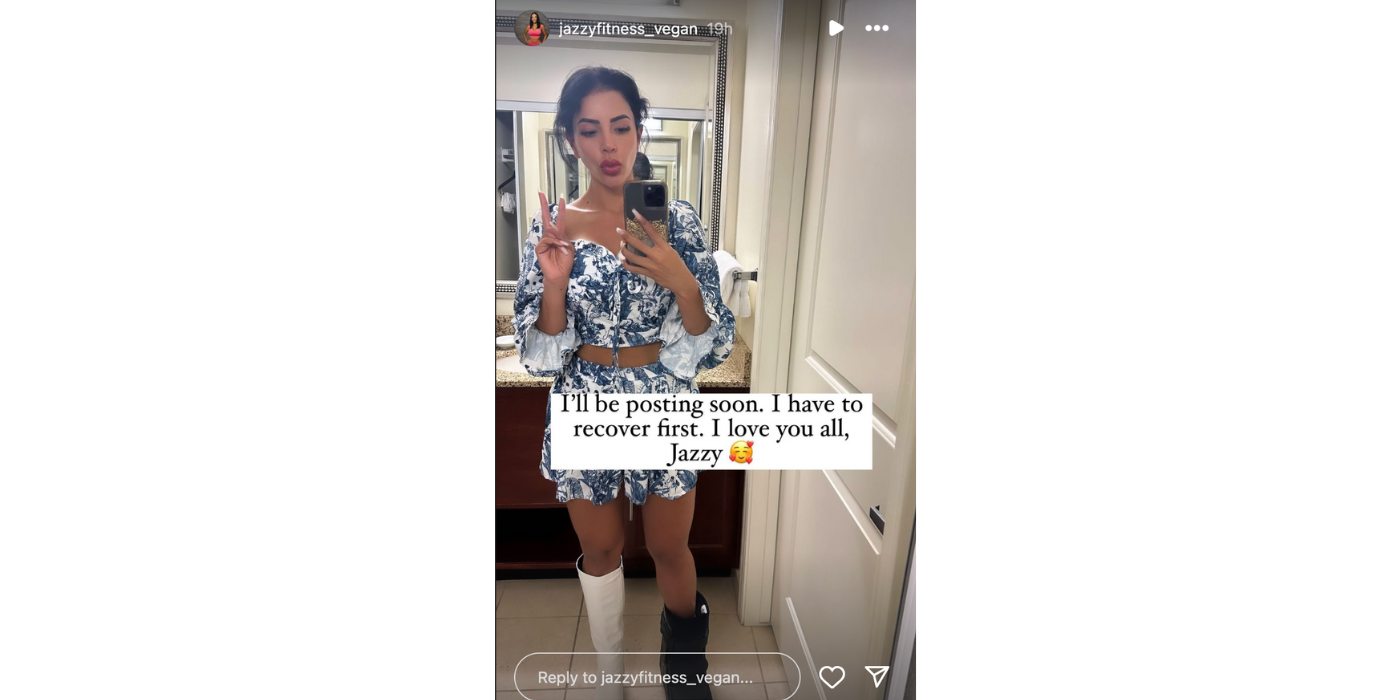 Jasmine prometió a sus seguidores que empezará a publicar pronto. Ella añadió que ella quiere recuperarse completamente antes de compartir cualquier video de ejercicios en su cuenta de fitness. “Los amo a todos, Jazzy.”, escribió Jasmine en la leyenda de su historia de Instagram. La foto mostraba a Jasmine usando una bota blanca hasta la rodilla en su pierna derecha. En su pierna izquierda, Jasmine llevaba una bota ortopédica para andar. Si bien Jasmine no explicó la naturaleza de su lesión, podría haberse torcido el tobillo o haberse roto los huesos de la parte inferior de la pierna, el pie o el tobillo.