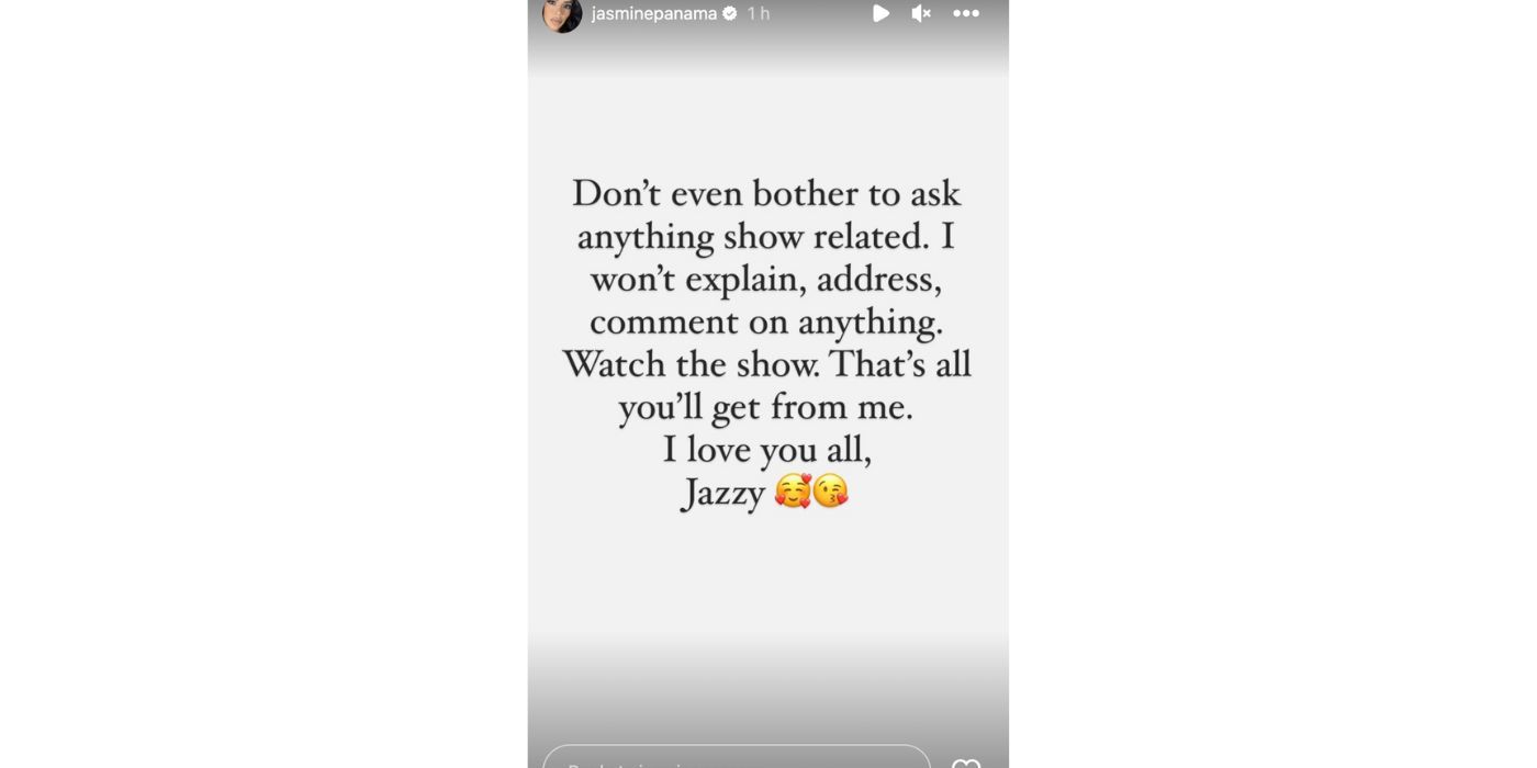 - Jasmine les dice a sus seguidores en Instagram que no hagan preguntas relacionadas con el programa y les pide que sigan mirando.