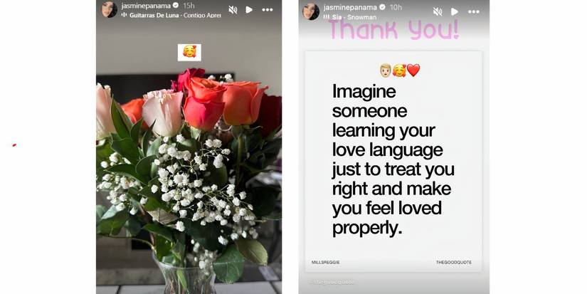 Jasmine dejó en claro que no fue Gino quien le regaló las flores. Gino ni siquiera estaba presente y parecía que estaba pasando tiempo con su perro Coco. Más tarde, Jasmine publicó una historia de Instagram para volver a publicar una cita que le pareció identificable. Quizás quiso agradecer a su misterioso admirador. sin que los demás sepan quién era. Ella escribió, “Gracias,”, ya que la cita habla de lo maravilloso que es cuando alguien aprende el lenguaje del amor, lo trata bien y lo hace sentir amado adecuadamente.
