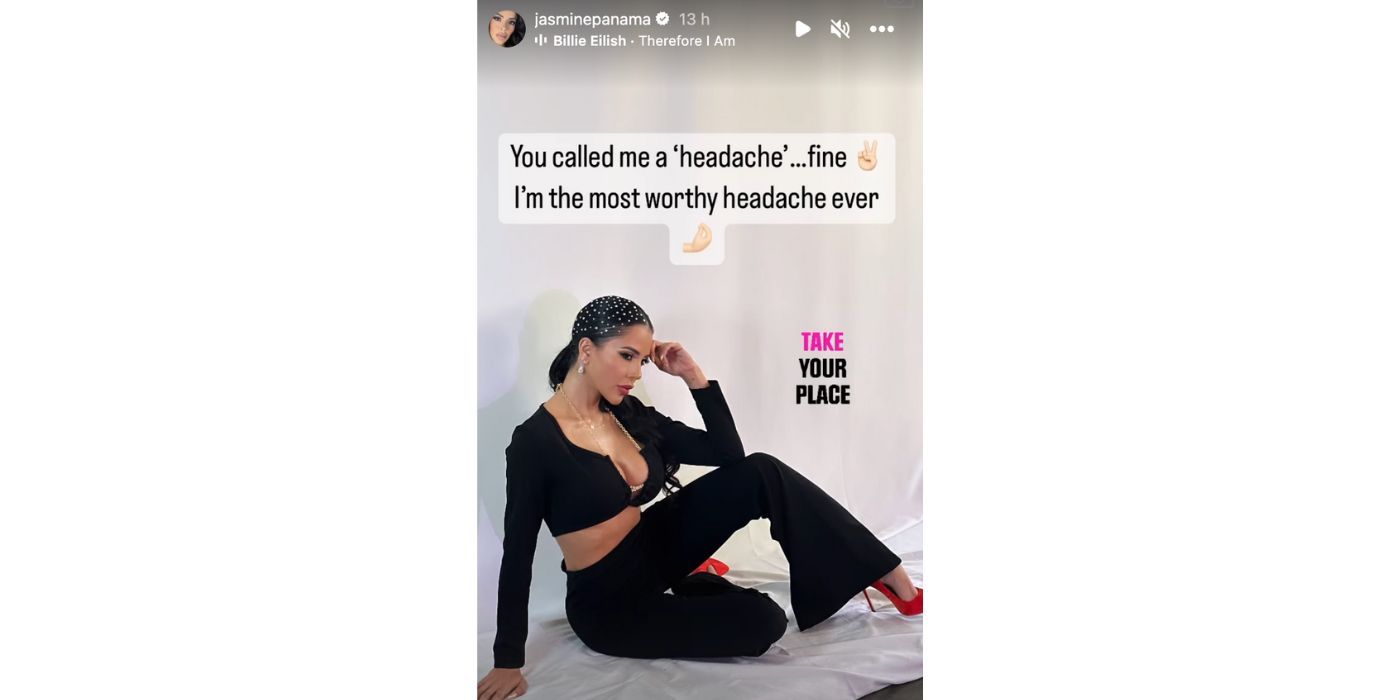 Alguien parece haber dicho que Jasmine es una “dolor de cabeza,” lo que la molestó. Publicó una foto de lo que parecía una sesión de fotos profesional. Vestida con un top corto negro y pantalones negros acampanados, Jasmine tenía el cabello liso con perlas usadas como decoración. No reveló para qué estaba posando. o si había lanzado su nueva carrera como modelo, pero aprovechó la oportunidad para criticar a sus críticos. “Me llamaste ‘dolor de cabeza’…bien. Soy el dolor de cabeza más digno de todos los tiempos.,” y añadió una pegatina que decía: “Toma tu lugar“.