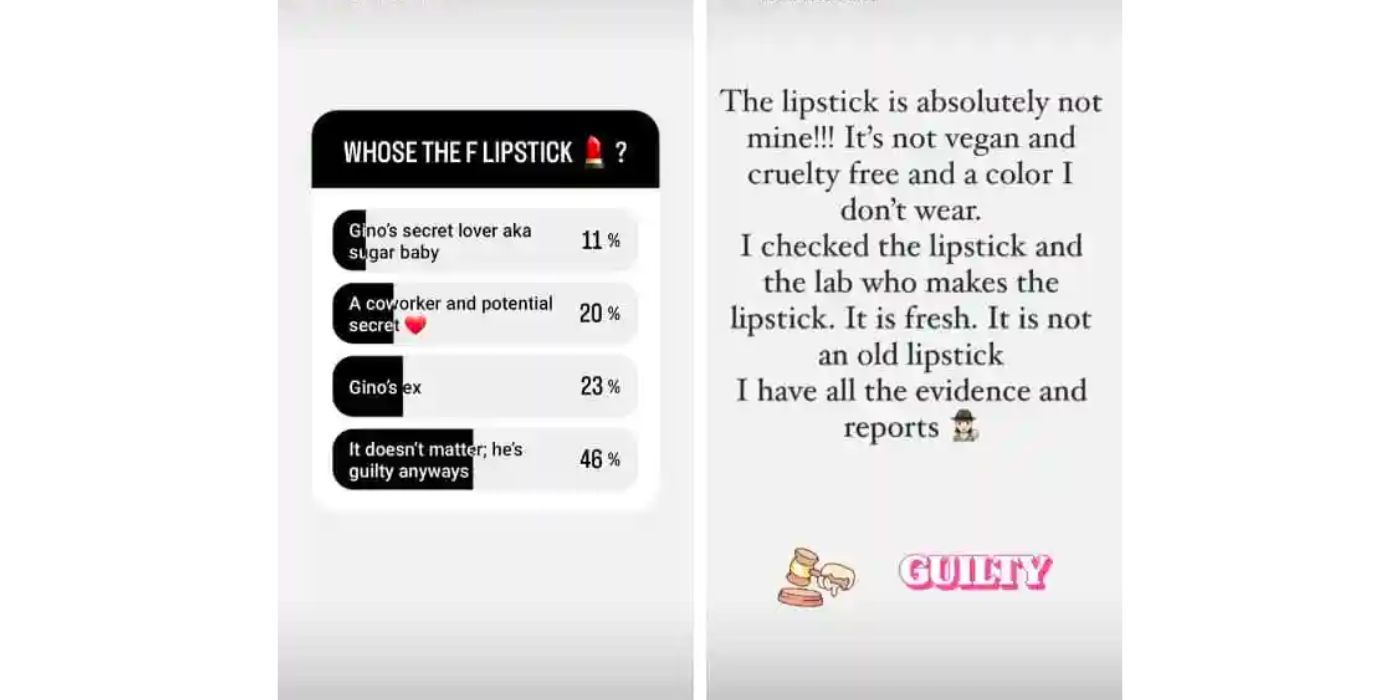 “/> Jasmine compartió una encuesta en sus Historias de Instagram. para descubrir a quién pensaban los fans que pertenecía el brillo de labios. La mayoría de los fans de Jasmine votaron por “la ex de gino” y “No importa, él es culpable de todos modos..” Algunos de los fans de Jasmine incluso creyeron que pertenecía a un “potencial amante secreto,” y algunos pensaron que era “El amante secreto de Gino, también conocido como Sugar Baby.” Jazmín escribió, “¡¡¡El lápiz labial no es mío en absoluto!!!“
