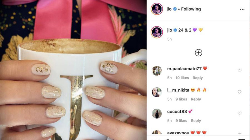 López enseñó su manicura de color crema con puntitos dorados y los números “24 & 2”, pintados con un pincel fino o marcador especial también en color oro, y dos corazones con el amarillo y el morado del equipo de baloncesto Los Ángeles Lakers, en el que Bryant desarrolló parte de su carrera profesional.