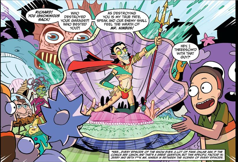 Después de que Jerry señala su relación con Nimbus, aparece una nota a pie de página en el cómic, rompiendo la cuarta pared para discutir si el Rick y Morty Los cómics son un canon del universo del programa. Si bien no aborda la cuestión por completo, continúa afirmando definitivamente que no solo Beth, Jerry y Nimbus siguen juntos, sino que Lo están haciendo entre cada escena del programa. Dada la montaña rusa emocional del matrimonio de Jerry y Beth, promete ser siempre incómodo; dentro de esta misma Especial de aniversario, Beth busca en Internet para ver si es normal divorciarse dos veces de la misma persona.