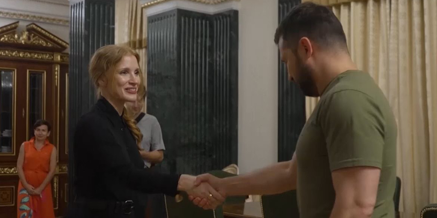 Apretón de manos con sonrisa incluida y manos a la obra. Jessica Chastain se sentó la mesa de uno de los despachos del emblemático edificio junto al presidente y miembros de su gobierno. Hablaron del conflicto armado y quizá diseñaron una hoja de ruta para programar la visita de la mujer de Gian Luca Passi de Preposulo. Según medios locales, la intérprete va a visitar el Hospital Infantil Okhmatdyt en Kiev, así como Irpin, una ciudad satélite en las afueras de la capital y que sufrió importantes daños tras el ataque de las tropas de Putin.