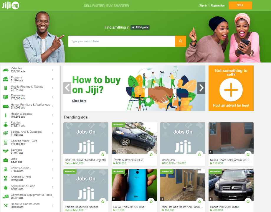 Los compradores y vendedores en esos mercados usan Jiji para realizar transacciones de compras de bienes raíces a ventas de automóviles.