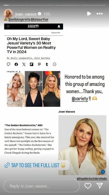 En una historia de Instagram ahora caducada, joan compartió que estaba emocionada de ser nombrada una de Variedad‘s Las 30 mujeres más poderosas de los reality shows en 2024. “Es un honor estar entre este grupo de mujeres increíbles”. Joan escribió junto con algunas capturas de pantalla de la publicación, agradeciendo a Variety por el honor. Según la publicación, Juana era “una de las mujeres más queridas” en el Bachiller franquicialo que le permitió tener la oportunidad de estar en “su merecida atención en la primera temporada del spin-off”. La conexión de Joan con Bachiller Nation ha sido una de las partes más emocionantes de su temporada.