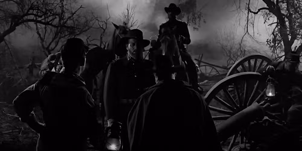 Sin embargo, cualquiera que esté remotamente familiarizado con los papeles más famosos del Duque en la pantalla grande habría reconocido inmediatamente su voz durante la escena en cuestión. Su momento llegó en el penúltimo capítulo de esta hora de duración. Tren de vagones especial, cuando su personaje llegó repentinamente a un campo de batalla de la Guerra Civil para informar noticias al general Ulysses “Sam” Grant.